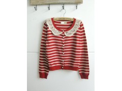 2012秋季新款日式歐-力花邊領條紋圓領修身女長袖針織衫