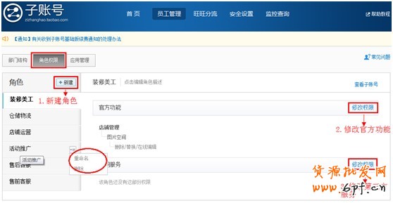 運營同學可以使用子賬號管理商品和店鋪;營銷同學可以使用子賬號搭配套餐、發送優惠劵;物流同學可以使用子賬號發貨、修改地址、使用物流小工具;美工同學還可以使用子賬號裝修店鋪!