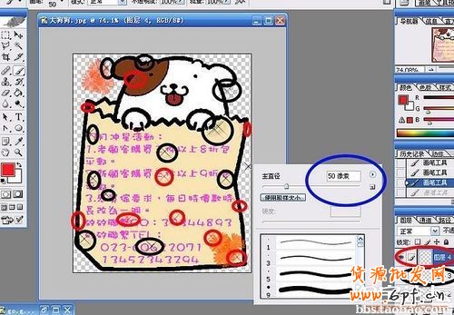 最左邊的小紅圈是畫筆工具,千萬別和歷史畫筆弄混了哦,點擊右上角的畫筆,可以選在很多,有PS自帶的,有矽矽自己下的哦.最下面的紅圈是可以改變畫出來的大小,其實惦記圖片,然后反選也可以改變的啦.