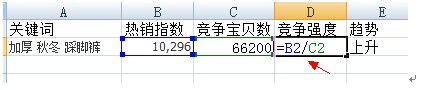 競爭強(qiáng)度該怎么算呢?競爭強(qiáng)度其實就是等于:熱銷指數(shù)/競爭寶貝數(shù),數(shù)值越大則表明競爭越小,數(shù)值越小則表明競爭越大。如圖: