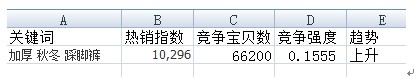 大家可以在excel的表格里分別寫上:關(guān)鍵詞丶熱銷指數(shù)丶競爭寶貝數(shù)丶競爭強(qiáng)度還有趨勢。接下來大家就把關(guān)于“踩腳褲”的那27個關(guān)鍵詞都復(fù)制粘貼下來,熱銷指數(shù)不用說,在后面可以看到,“趨勢”也可以在后面看到,紅色箭頭代表上升,綠色箭頭代表下降。那么競爭寶貝數(shù)和競爭強(qiáng)度怎么算呢?競爭寶貝數(shù)的方法很簡單也很原始,就是把相應(yīng)的標(biāo)題去淘寶里面搜就可以了,搜出來的寶貝數(shù)是多少就是多少(其實如果有數(shù)據(jù)魔方的話,這里就非常簡單的,我們要說的就是在沒有數(shù)據(jù)魔方的前提下該如何來分析)。