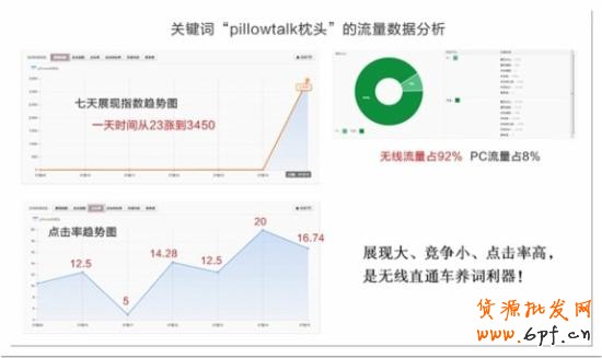 當確定候選詞后,下一步工作是確定其有無足夠的展現(xiàn)量,并且必須是無線端展現(xiàn)量。這依賴直通車后臺的新版流量解析,它能告訴你任何競價詞的詳細數(shù)據(jù),是決策選詞必備工具。