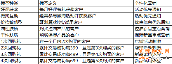 四、個性化營銷除了一般的客戶維系和營銷之外,珀萊雅還會利用ECRM的標簽體系,針對客戶的特點進行打標,通過個性化的分組將客戶分為油性膚質(zhì)、干性膚質(zhì)、價格敏感型、微淘互動型等客戶。下圖是珀萊雅設(shè)置的標簽種類: