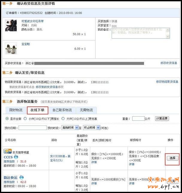 確認好第一、二步信息后,在第三步中選擇“在線下單”,在您所選擇的物流公司后點擊“選擇”