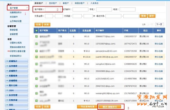 如圖15、首先點擊”客戶管理“然后在”客戶昵稱“里輸入顧客的ID號,最后點擊最下面的”贈送/調整積分“如圖16、如果是扣除積分則在積分前面加上“-”負號表示減去,接著輸入原因確定就可以了。同樣的,如果有什么節日或者客戶生日等也可以用這個方法給顧客增加積分。