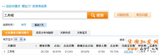 舉例來說,某產(chǎn)品的利潤為30%左右,按照數(shù)據(jù)魔方獲取的7天內(nèi)相關(guān)數(shù)據(jù),如果要完成5筆交易,關(guān)鍵詞“工具箱”需要的點擊為5/0.0146=343個(舍去小數(shù)點)。按直通車點擊均價0.65元每個點擊計算,點擊成本為343個×0.65元/個=222.95元。完成5個產(chǎn)品成交的金額為430元,產(chǎn)品利潤是430×0.3=129元。賣出去5個產(chǎn)品只能獲取129元利潤,但是直通車的推廣費(fèi)用就高達(dá)222.95元。經(jīng)過這樣的一番盤算,推廣“工具箱”這個關(guān)鍵詞橫看豎看都是行不通的。