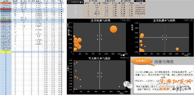 這個是朋友的店鋪,調用了30天的數據,包括訪客數、成交金額、成交件數、跳失率、轉化率、收藏率、下單率等7項數據,然后生成氣泡圖,并根據這些數據分析,得出在您的店鋪當中除了已成型的爆款,還有哪些商品值得您重視,哪些商品是被自己忽視過的,并給出改進意見,比如頁面優化、運營手法、促銷手段,商品本身在營銷方面存在的短板等,擁有這樣的一個全店寶貝數據,我們不僅可以對店鋪每一款寶貝的情況了如指掌,還可以通過人為干預快速提升寶貝爆發的過程。
