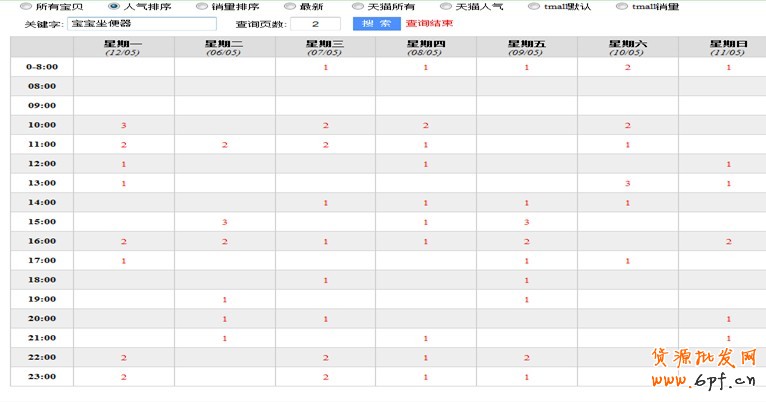 然后,我們查詢這些關鍵詞下,對自己有威脅的寶貝的上下架情況。比如“寶寶坐便器”這個關鍵詞,人氣排名在第2頁第40名,那么我們就把人氣下前兩頁的所有寶貝的上下架都通過軟件查詢出來形成下圖: