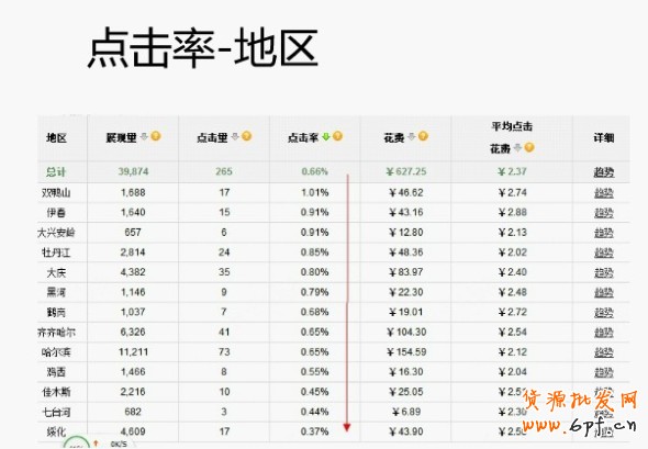 4、改變投放地區:如下圖,可在直通車后臺--基礎數據--地區中,查看各地區的點擊率數據,取消點擊率低的地區的直通車投放