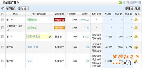 由上圖可以清楚看出,推廣計劃設定很清晰,泛詞和精準詞,定向計劃單獨分開做,主要是因為點擊率相互獨立,各不影響,點擊率的高低跟質量得分密切相關。另外對于不同用處的關鍵詞可以分別通過計劃管理,有針對性的設置投放時間投放區域等。定向計劃可以通過時間和人群的單獨設置更快的被抓取入池。另外定向的流量偶爾會不穩定,可以通過單獨的設置日限額和投放時間來進行控制。并且不會影響到關鍵詞的正常投放。如何提升點擊率?除了把精準詞單獨挑出來之外還有做不同的推廣圖片進行測試,選出最適合這款寶貝推廣的圖片。