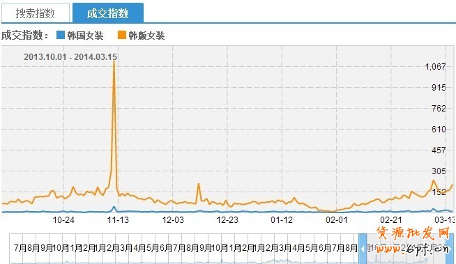從搜索指數和成交指數來說,韓版女裝的人要比韓國女裝高。在這方面韓版女裝看起來要比韓國女裝好。