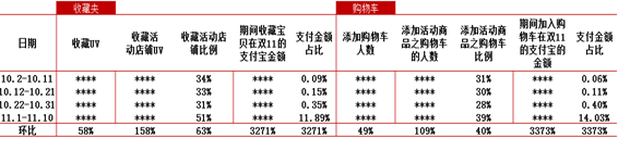 11.1~11.10加入購物車和收藏夾的寶貝,雙11成交占總成交的24%。雙十一已然來臨,推廣人員的壓力很大,雙十一的業績目標是否能實現,很多程度上與推廣有著密切的關系。假設雙十一目標1500W銷售額-女裝類目,通過銷售流量分解后,鉆展需要引流8萬 UV才能實現雙十一業績目標。