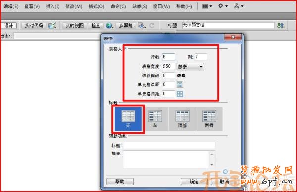 接著,我們點擊【插入】菜單,這是可以看到【表格】項目,點擊,在表格中輸入【5行,7列,表格寬度950,邊框粗細0,單元格邊框、間距0,標題選擇“無”】,如下圖