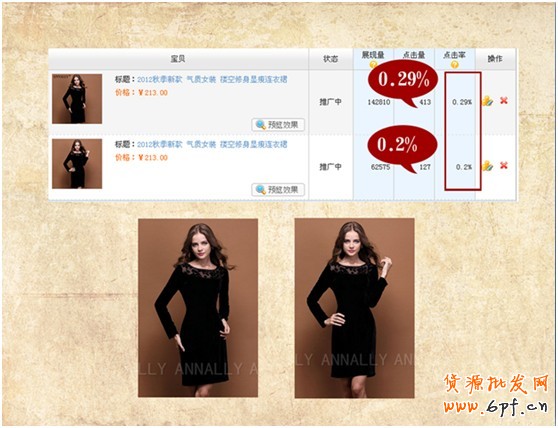 挑選出點(diǎn)擊率最高的模特圖及對(duì)應(yīng)底圖之后,下一步就可以考慮圖片的重心問題。如下圖這款連衣裙考慮在直通車的位置顯示的是210*210的大小,這個(gè)規(guī)格偏小,使得圖片如果視角過大會(huì)造成不清晰,把產(chǎn)品拉大之后就可以更加看到客戶想要的,從而增加爆光率。下圖中的左圖是原圖,右圖是放大圖,放大后圖片點(diǎn)擊率增加了0.13%。