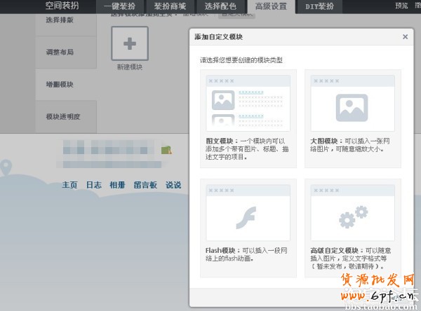 再次進入QQ空間點擊:裝扮---高級設置---增刪模塊---自定義模塊---新建模塊---添加大圖模塊。