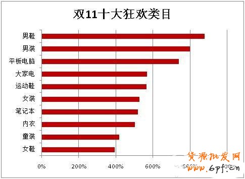 狂歡類目指的就是雙11當天受益增長最大的類目。基本上與服裝相關的類目都有上榜:男裝、女裝、男鞋、女鞋、童裝、內衣、運動鞋。這些類目占據了狂歡排行榜里面的多數席位。其中,女裝的增幅排名雖然相對靠后,但是考慮到女裝龐大的規模,女裝依然是雙11的最大受益者。