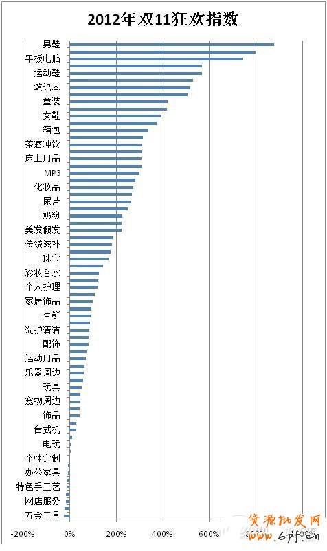 我們以2012年10月份的數據為基準,計算各類目雙11當天成交商品數的增幅,結合類目的整體規模,得出了類目在雙11這一天的“狂歡指數”(詳見附)。基于該指數,我們評出了去年雙11的三個類目榜單。