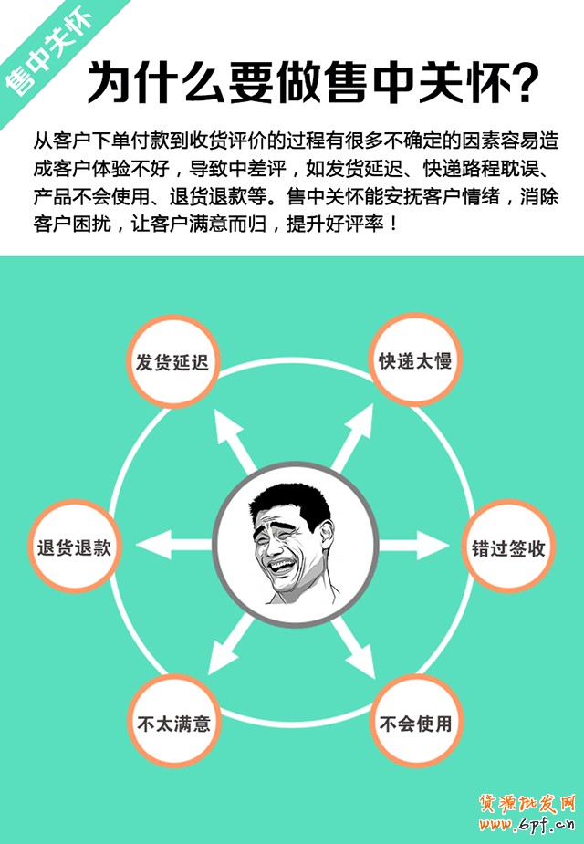 1、從客戶拍下付款后到客戶收到寶貝中間有很多不可避免的問題造成客戶體驗不好,如果不解決這些問題很容易造成客戶差評;