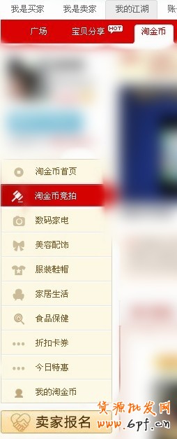 答:進入我的江湖——淘金幣——左側菜單中最后按鈕——賣家報名——在出現的新頁面點“我要報名”