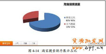 寶貝搜索有兩種主要的排序方式,人氣排序和所有寶貝排序。人氣排序目前不是默認的排序方式,人氣搜索與所有寶貝的展示占比目前大概是10%~20%和80%~90%,如圖4-14所示。所有排序中還有按照價格從低到高、從高到低排序、銷量排序、信用從高到低排序的選項,這些排序的原則也很明確,基本上是按照選項來的,從名字上就可以知道其規則。