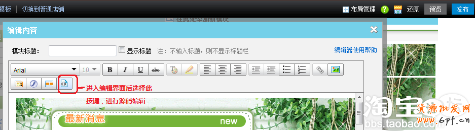 9:編輯好所以的版塊后點擊HTML源代碼選項,獲取源代碼。必須要一個字符不少的復制下來。