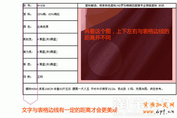 這個淘寶寶貝詳情表格設計,掌柜已經(jīng)注意到了圖文并茂這種方式。但是卻沒有注意到文字、圖片與表格邊線之間的距離。看下圖:
