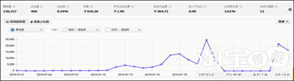 (2)ROI:由于店鋪產品客單價較低,所以直通車的ROI想要做高非常困難,所以長期以來我們都是更關注CVR。但是,自2014年5月份千人千面功能陸續(xù)完善后,直通車上的寶貝可匹配的流量和精準度更高了。這時候,店鋪的爆款由于受眾群體大,定向人群也比較可觀,出現(xiàn)了一個流量高峰。于是,我們抓住機會,改為更多的開始關注ROI。