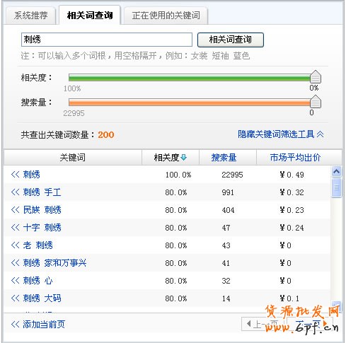 可以參照寶貝標(biāo)題屬性,例如:推廣一款刺繡的連衣裙,可以將“刺繡 連衣裙”拆分成三個(gè)中心詞“刺繡”、“連衣裙”、“刺繡 連衣裙”,然后分別按照這3個(gè)中心詞去添加一系列更精準(zhǔn)的關(guān)鍵詞。(可以按照提供的3個(gè)排序按鈕進(jìn)行排序)