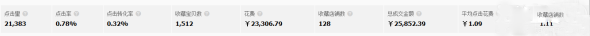 從圖中可看到,1個月的點擊量大概在2萬多,而平均每天點擊量不到1000,PPC在1塊錢左右,也就相當于是每天花費1K左右,ROI在1.11,點擊轉化率為0.32%,收藏成本為15.4元。