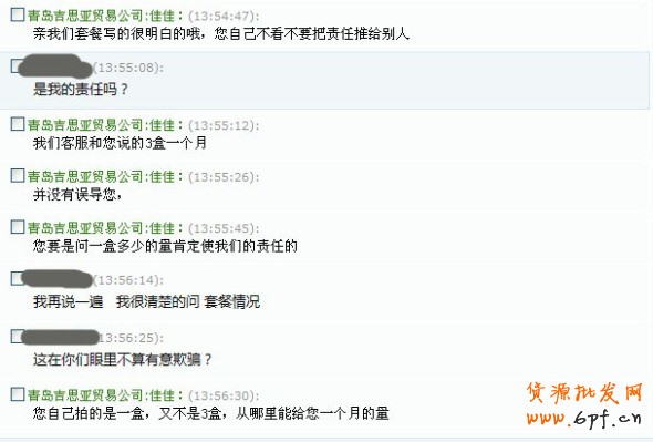 事情是這樣的:買家拍了1套4樣產(chǎn)品,我們照發(fā)了,但是買家問我們客服一個月療程是幾盒,客服答3盒。買家認為一療程3盒,應該是發(fā)3盒才對,認為我們少發(fā)了,客服堅持沒錯并且不補發(fā)。買家一怒給了4個差評,客服年輕氣盛,毫不猶豫的回罵了。