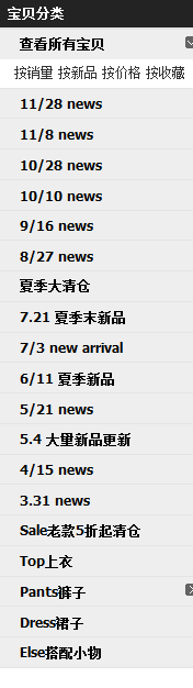 寶貝分類:談到導(dǎo)航欄,我們間接說一下寶貝分類吧!詳細(xì)的寶貝分類能讓買家方便快捷地找到自己想要的商品,給顧客提供引導(dǎo)、選擇的索引,分類不要太花哨,美觀大方、清晰就行。分類設(shè)置可以有多種,讓客戶選擇全面一些,比如:按上下架寶貝的時(shí)間分、按價(jià)格分、按種類分、按材料分、按包裝分、按季節(jié)分等等。顧客能夠輕易找到自己的需求產(chǎn)品,你就達(dá)到目的了。