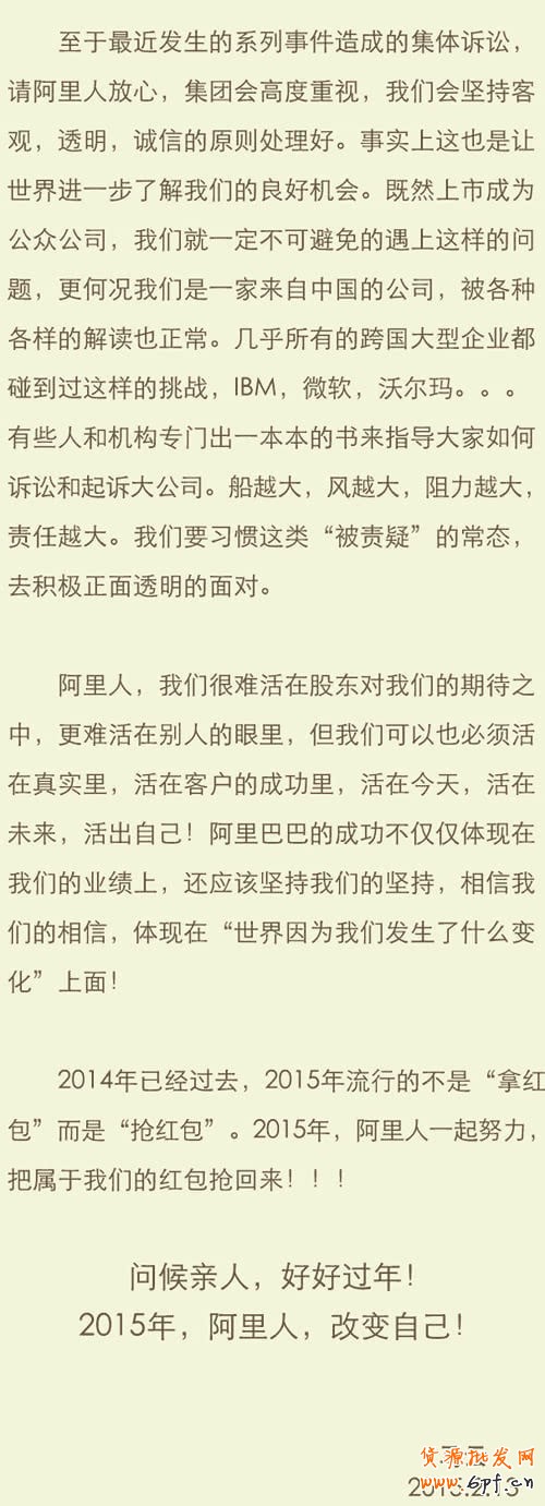2月13日,馬云在題為《2015,阿里人,改變自己,創造未來!》的致員工信中表示:集團管理層經過認真思考討論,決定今年阿里巴巴集團不給全體員工發放紅包。