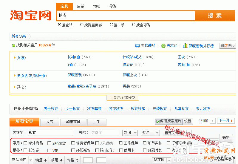 舉例我們搜索“秋衣”這個關鍵詞,總共搜索到169274件寶貝,如果您不是大賣家,寶貝又不是快下架的情況下,那么您被買家搜索到的幾率幾乎為零,如下圖
