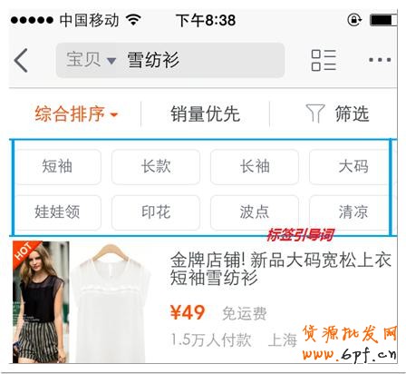 (1)把你的產(chǎn)品詞或者(產(chǎn)品詞+修飾詞)作為起點,去手機淘寶上搜索,把它下方的8個擴展標(biāo)簽詞 (如下圖所示) 記錄下,并且作為下一次的起點來再次搜索擴展。例如,雪紡衫,擴展為“短袖雪紡衫、長款雪紡衫、長袖雪紡衫、大碼雪紡衫、娃娃領(lǐng)雪紡衫、印花雪紡衫、波動雪紡衫、清涼雪紡衫”,然后這8個分別再進行擴展,這樣就有了8*8=64個詞。
