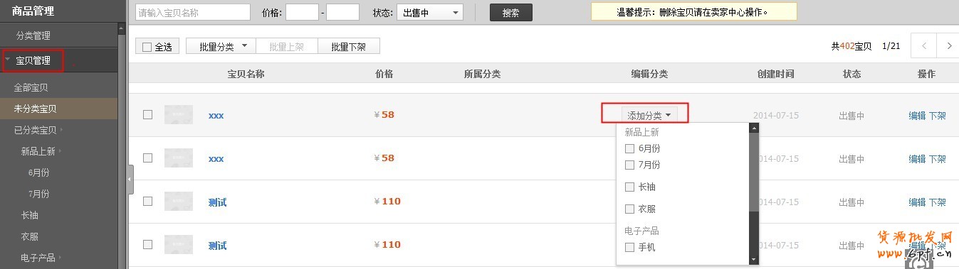 第三步:對現(xiàn)有寶貝進行分類,點擊“寶貝管理”,對當前寶貝進行添加分類編輯,勾選要放入對應(yīng)的分類中即可。