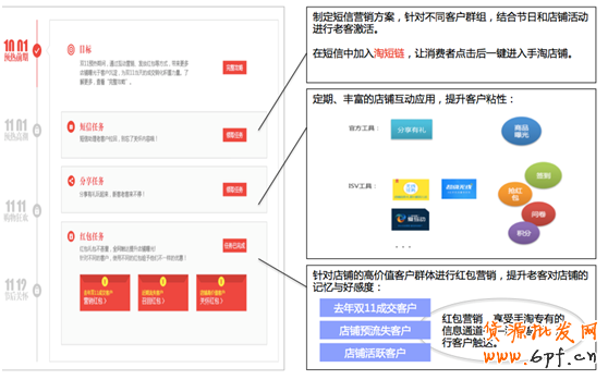 還有非常重要的一點,就是我們需要在預熱前期的這個階段,在店鋪里面去引入無線互動工具,向消費者提供定期的店鋪內(nèi)互動。最簡單有效的方式,就是采購一個第三方服務商的CRM無線互動應用,這些應用通常都幫賣家設置了多達20多種的互動任務,賣家可以根據(jù)自己店鋪的特點在去設置具體的任務,讓消費者每日進店來完成任務,獲得積分或者紅包等獎勵。通過這樣常態(tài)化并且有趣的一些任務來讓消費者養(yǎng)成每天進店做任務領(lǐng)獎勵的習慣。這樣整個店鋪的人氣就上來了,客戶的活躍也做起來了。無線互動應用的涌現(xiàn),也是在整個平臺無線化趨勢下的一個大變化,這些應用可以很好的幫助賣家做無線店鋪的客戶互動。商家可以從服務市場上尋找一些優(yōu)秀的第三方服務商提供的CRM無線互動應用,布局在手淘店鋪內(nèi)做客戶互動與粘性。