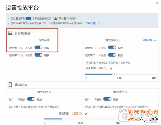 1、在直通車計劃設置投放平臺,計算機設備端的“搜索推廣”選擇投放。