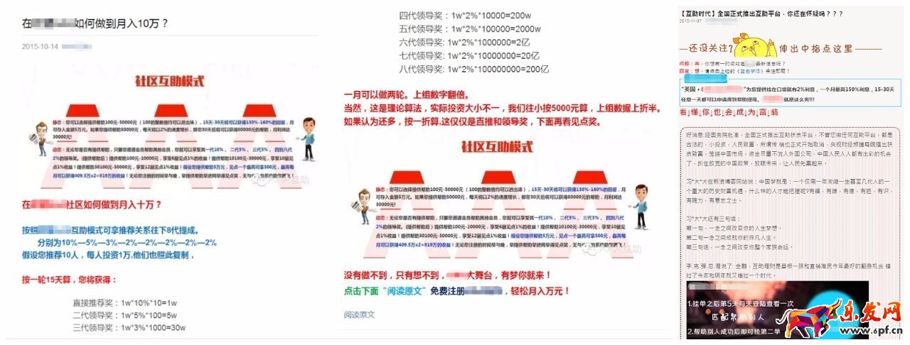 近期,平臺發現有用戶利用微信關系鏈,通過微信公眾帳號實施多級分銷欺詐行為,發布分銷信息誘導用戶進行關注、分享或直接參與。此模式多數包裝為新型商業模式、創新金融產品、互助扶貧、國家幫扶計劃等,本質在于利用關系鏈發展人員,形成多級上下線關系,按照下線人數或者銷售業績計算盈利,與傳銷行為類似,一定程度上具有金字塔欺詐、龐氏騙局等特征。