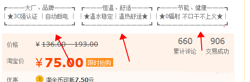 傳播個人覺得簡單暴利就好,可以間接一些在這里寫上七天無理由,贈送運費險,什么什么的,這樣簡單明了我個人更喜歡,送上一個模板。一一一大廠、品牌一一一 一一一恒溫、舒適一一一一一一節能、健康一一一 3C強認證 安全放心 溫水穩定溫熱舒適0輻射 不口干不上火 ┗一一一一一一一一一一一┛ ┗一一一一一一一一一一一┛┗一一一一一一一一一一一┛(復制后修改文字粘貼進淘寶即可)
