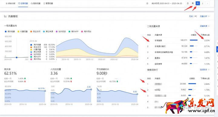 這里數(shù)據(jù)可以選擇 一天 ,一周 ,或者 一個(gè)月 ,通過一段時(shí)間了解店鋪的經(jīng)營(yíng)狀況。一級(jí)流量結(jié)構(gòu)級(jí)比重,淘內(nèi)免費(fèi)流量的占比60% 我們說都是健康的,