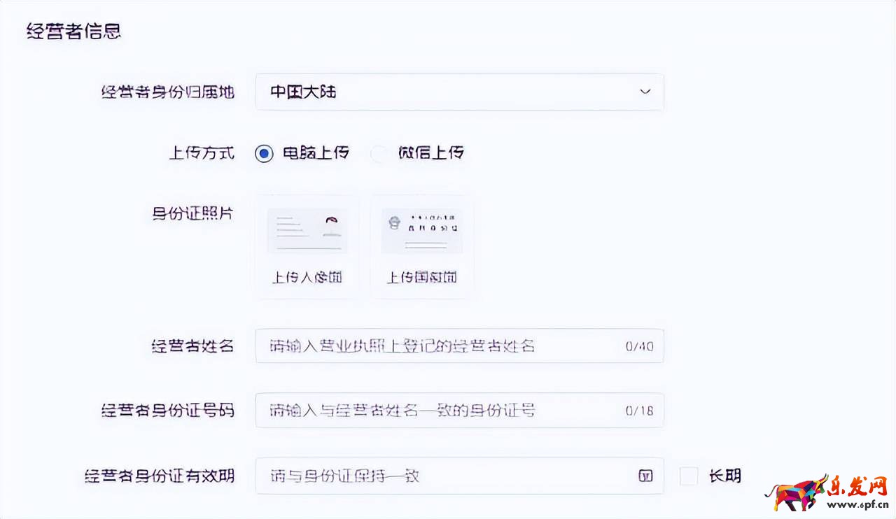 上傳店鋪經(jīng)營者身份證的正反面照片,必須是二代身份證,不要有任何遮擋信息,內(nèi)容清晰即可。